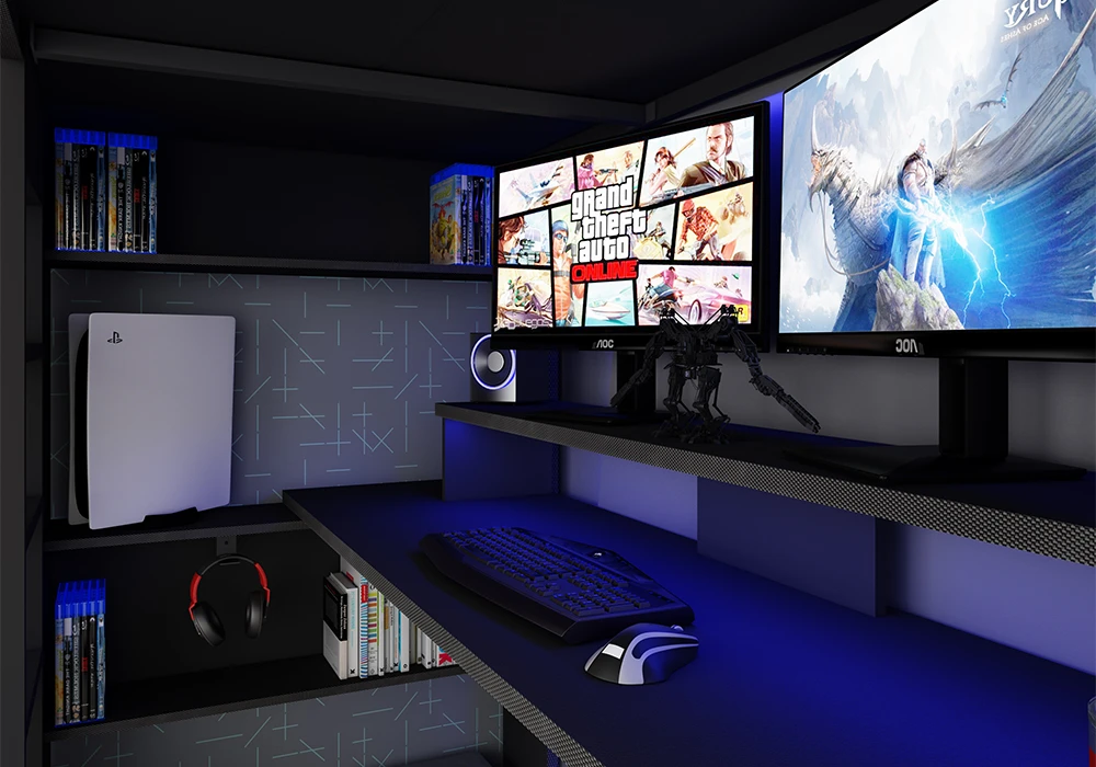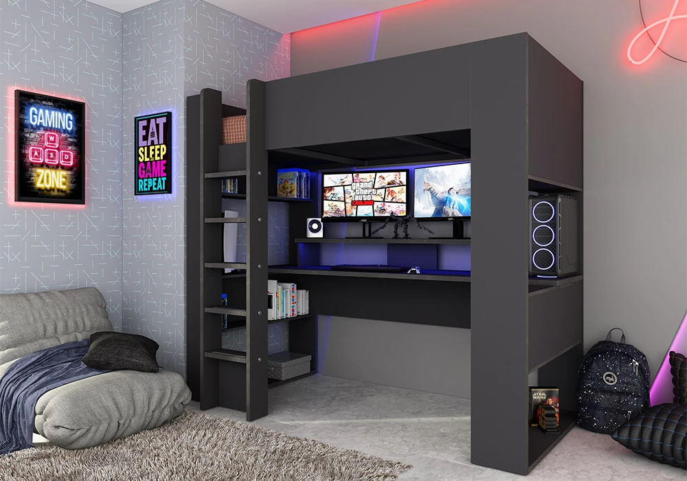 Plongez dans l’univers du jeu avec le lit compact Studio Gaming, une solution tout-en-un qui allie confort, fonctionnalité et design moderne. Idéal pour les jeunes gamers, ce lit mezzanine compact transforme n’importe quelle chambre en un espace de jeu et de travail parfaitement organisé.