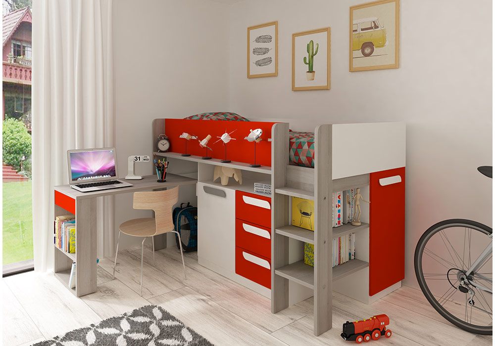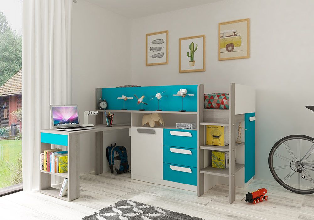 Le lit surélevé Compact est très pratique pour gagner de la place dans la chambre d’enfant: il comprend 3 tiroirs, des étagères et 1 penderie ajoutant beaucoup d’espace de rangement. Son côté astucieux, sa couleur ravissante et son confort exemplaire lui offriront toutes les conditions favorables qui permettront à votre enfant de passer une douce nuit.