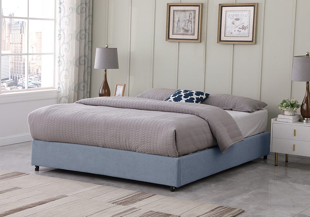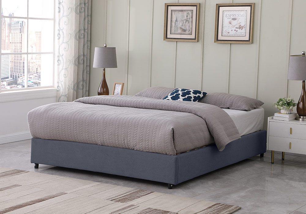Structure en BOIS MASSIF et panneau de particules recouvert de tissus gris clair, gris foncé ou taupe. Lit vendu AVEC SOMMIER SANS MATELAS.