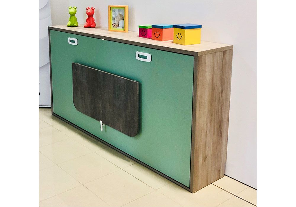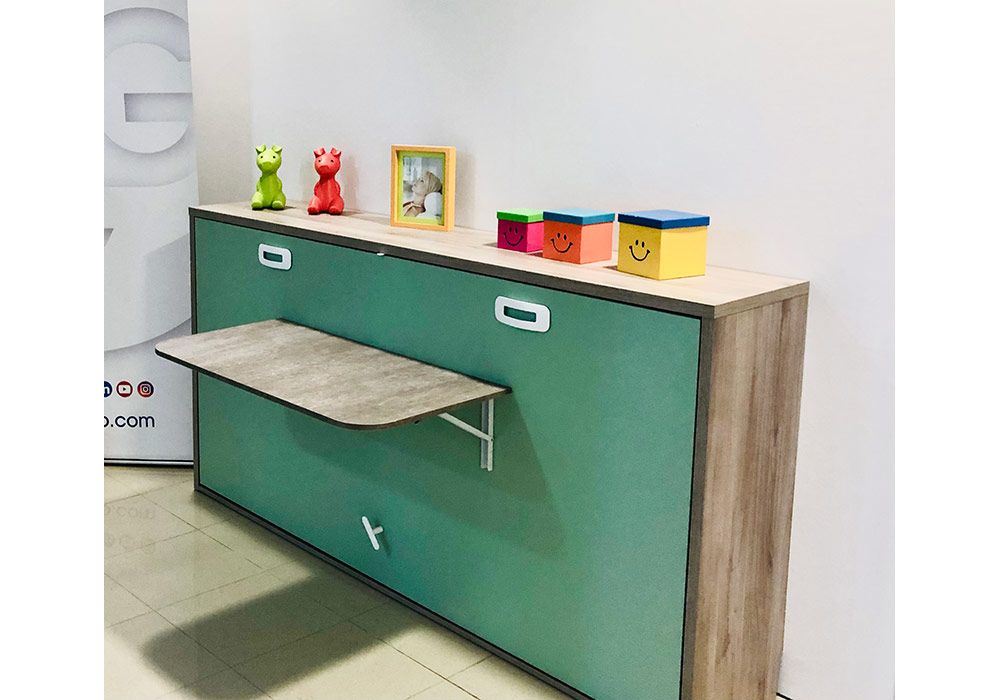 Un rangement complémentaire intégré au lit relevable, une armoire, lit escamotable avec plan de bureau pliable.