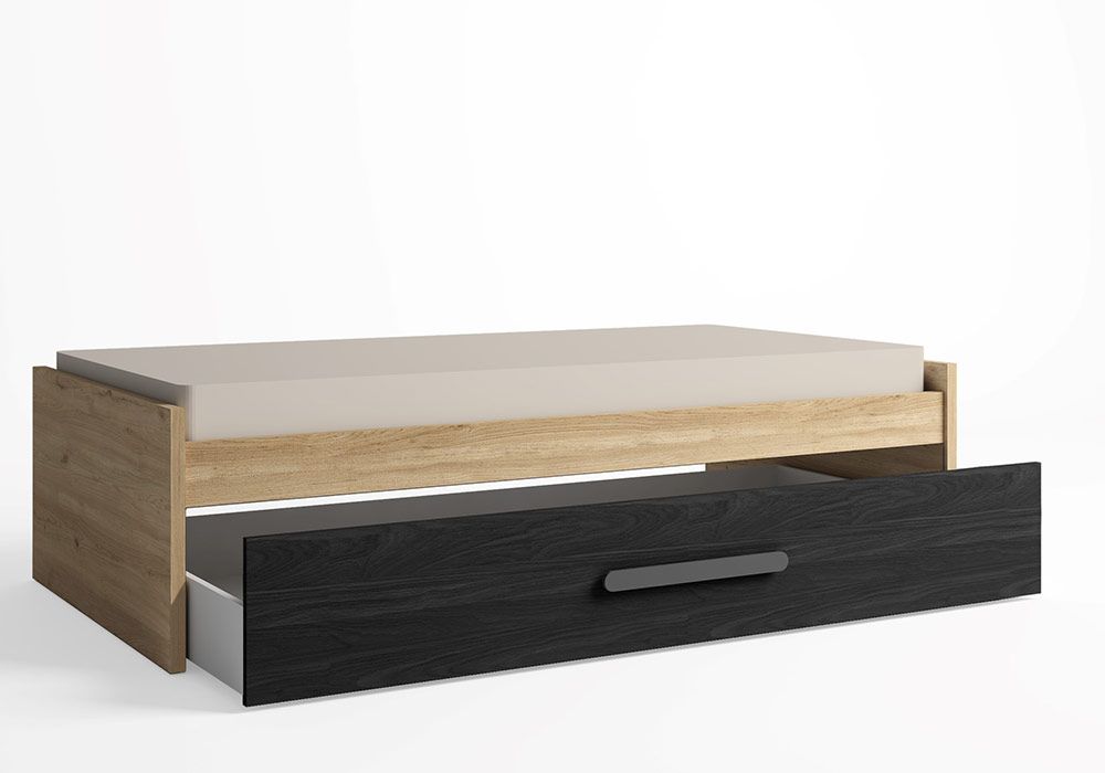 Structure en panneau de particules épais recouvert de papier décor naturel / noir. Lit Gigogne tiroir Compact Zen (L90xP190xH51cm) vendu AVEC SOMMIER SANS MATELAS. Livré avec 1 tiroir de rangement.