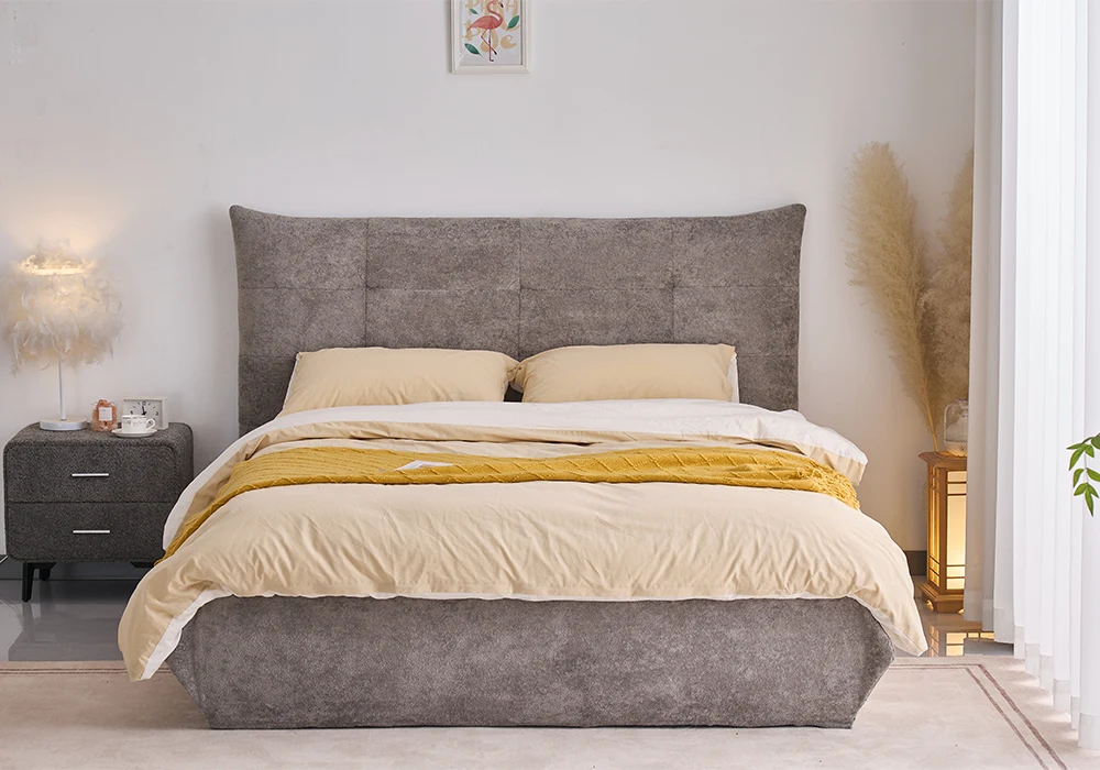 Le lit JEANNE 140×190 séduit par son design moderne et épuré, idéal pour créer une chambre élégante et chaleureuse. Son revêtement en tissu microfibre gris et ses lignes douces et arrondies apportent une ambiance cosy et contemporaine.
