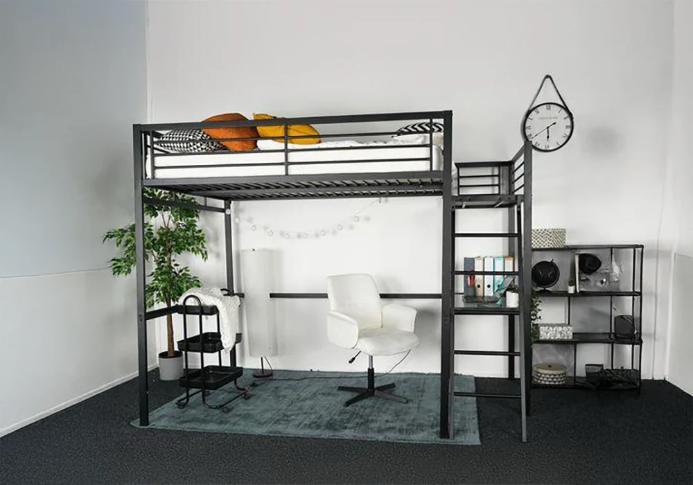 Le lit mezzanine Jozen incarne une vision contemporaine de l’aménagement intelligent. Sa structure en acier noir, aux lignes nettes et minimalistes, s’intègre avec élégance dans les intérieurs modernes, tout en offrant une solution gain de place remarquable.
