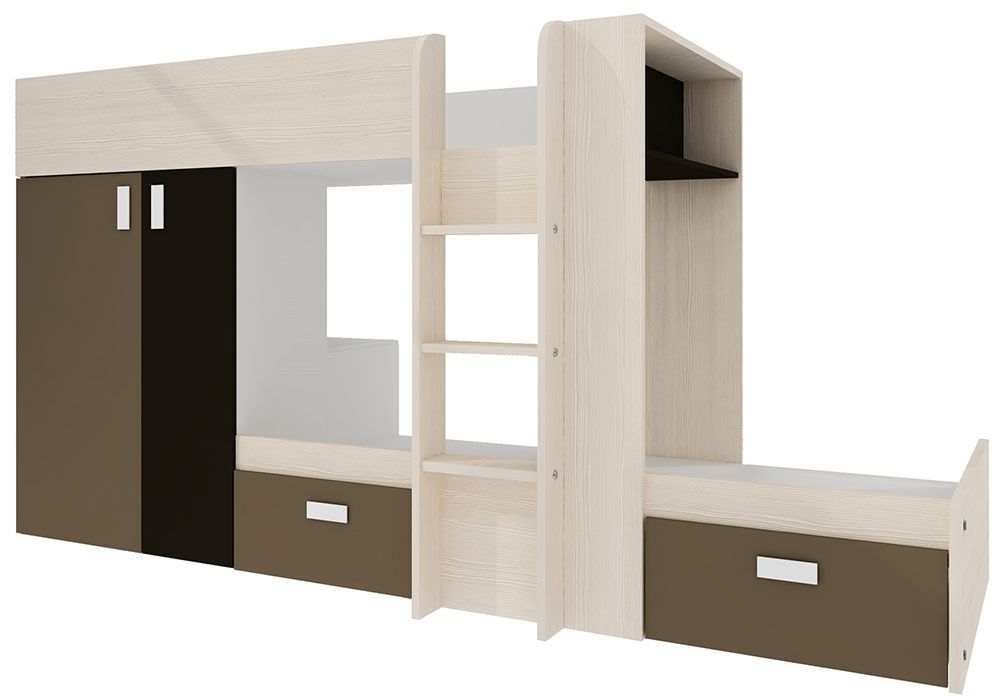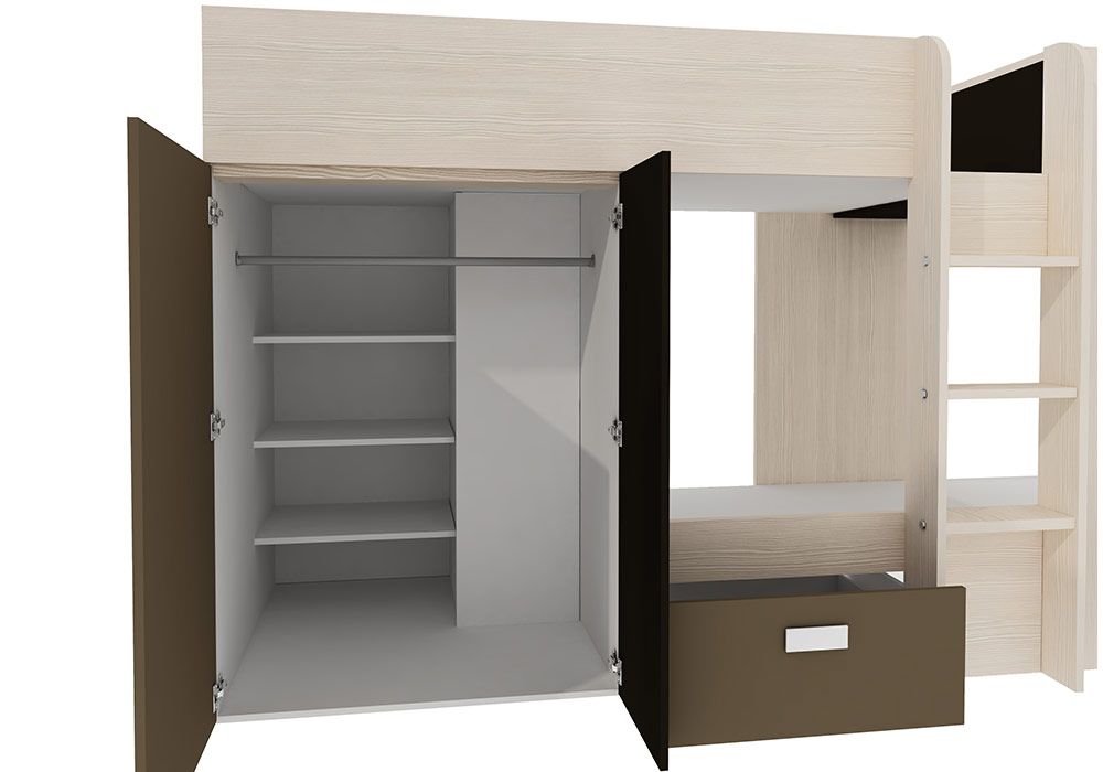 - Avec des détails tels que l’étagère supérieure et le renfoncement comme table de chevet pour le lit inférieur.