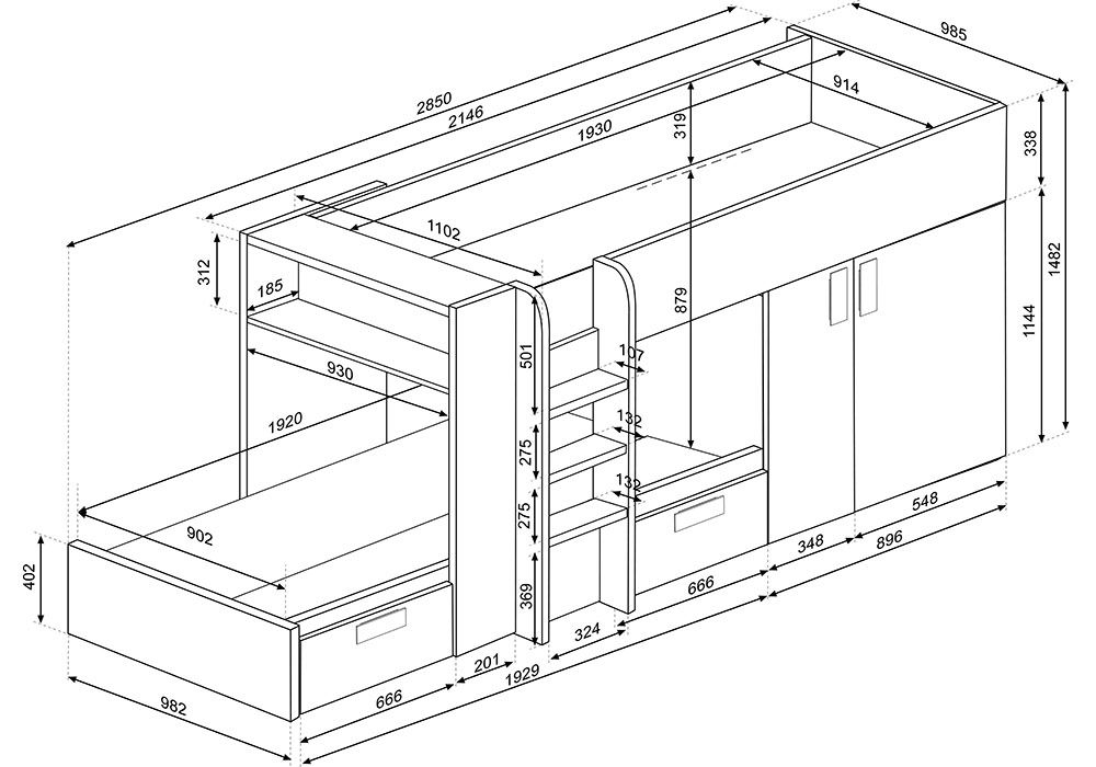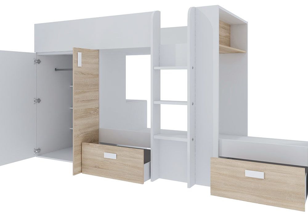 Ce lit-train est idéal pour libérer de la place dans la chambre de vos enfants. Il pourront ranger leurs affaires dans l’armoire, les 2 grands tiroirs et la niche. Des espaces sont également prévus pour déposer des lampes de chevet pour chacun des lits.
