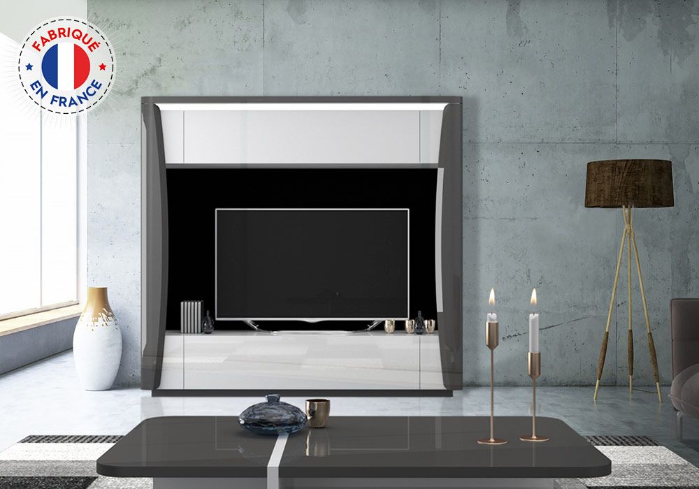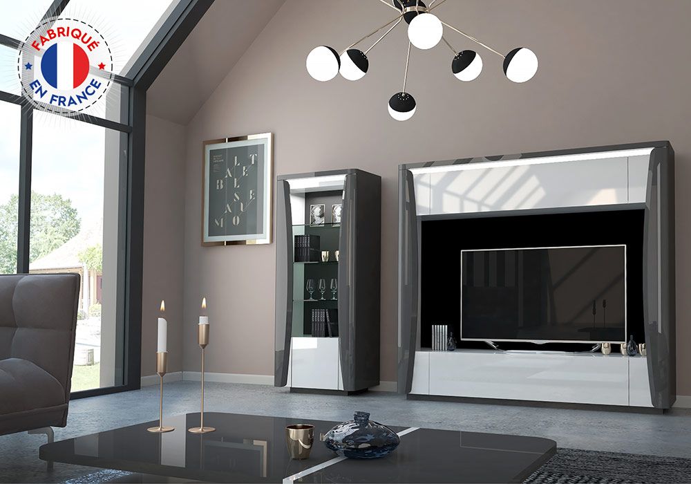 Design et moderne, le mur TV de la collection Tiago présente des lignes affirmées et une finition laquée brillante qui agrandiront votre pièce.