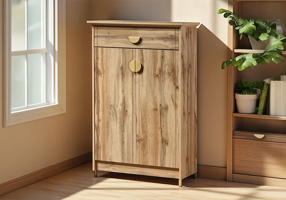 Découvrez notre meuble chaussure de la collection Carry, un véritable atout pour votre intérieur. Conçu avec une structure en panneau de particules, ce meuble est recouvert d’un papier décor chêne doré qui lui confère une allure élégante et intemporelle.