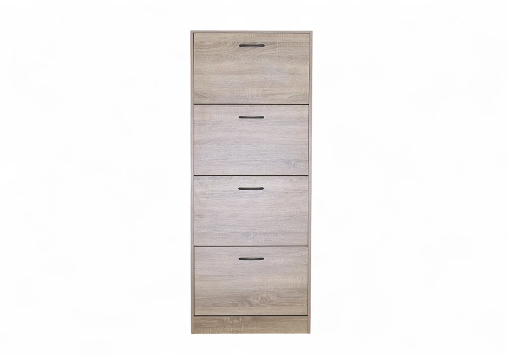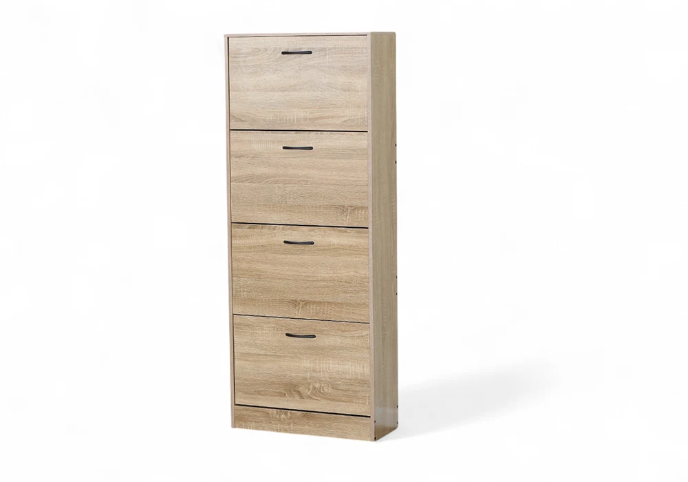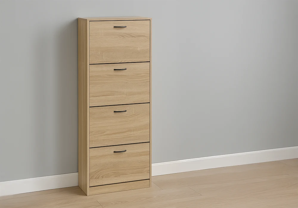 Sa structure en panneau de particules, soigneusement revêtue de papier décor coloris chêne, offre une finition homogène et facile à associer à différents styles d’intérieur. Les 4 abattants dissimulent astucieusement vos paires de chaussures tout en préservant une ligne épurée et compacte, idéale pour les petits espaces.