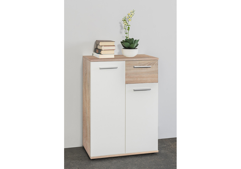 Laissez-vous séduire par ce meuble de rangement de la collection Jacky en couleur intemporelle chêne artisan blanc. Ce rangement est doté de 2 portes et 1 tiroir aux poignées esthétiques. Très fonctionnel, ce meuble est idéal et ne prend pas de place !