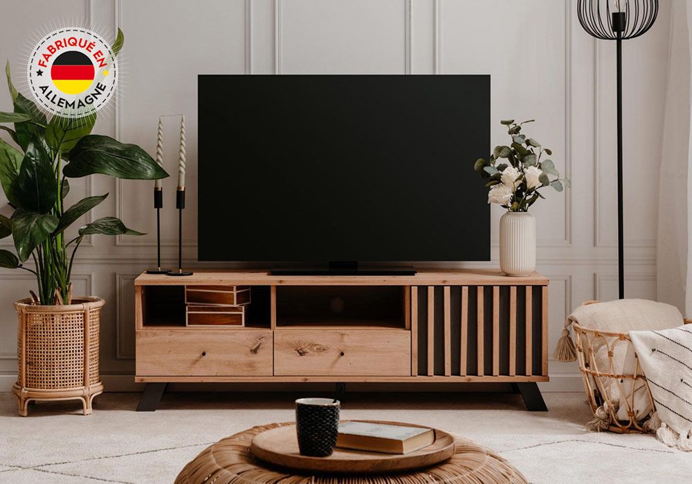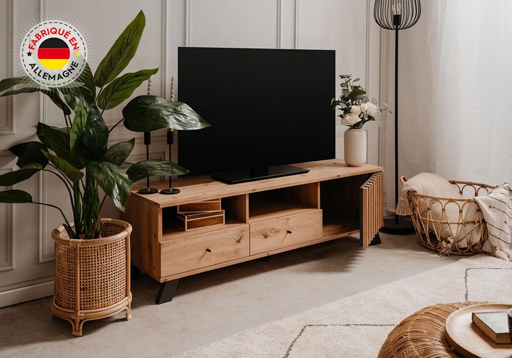 Le meuble TV Medan possède 2 tiroirs pratiques pour ranger les magazines ou matériel hifi. La chaleur de ses couleurs subliment la décoration déjà existante de votre intérieur.