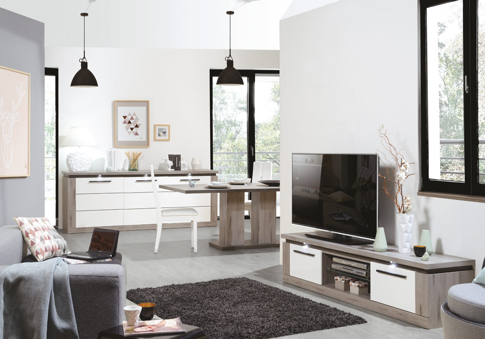Le coin séjour Oslo se compose de meubles (vendus séparément) pour agencer entièrement un salon. Buffet, vaisselier, meuble télévision, table à manger sont ainsi prévues pour aménager un salon confortable et agréable à vivre.