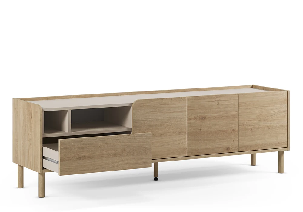 Pensé pour durer, ce meuble TV bas séduit par ses lignes épurées, sa finition soignée et sa capacité de rangement optimisée. Il accueille facilement un écran plat tout en conservant une silhouette équilibrée et discrète.