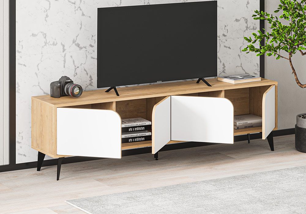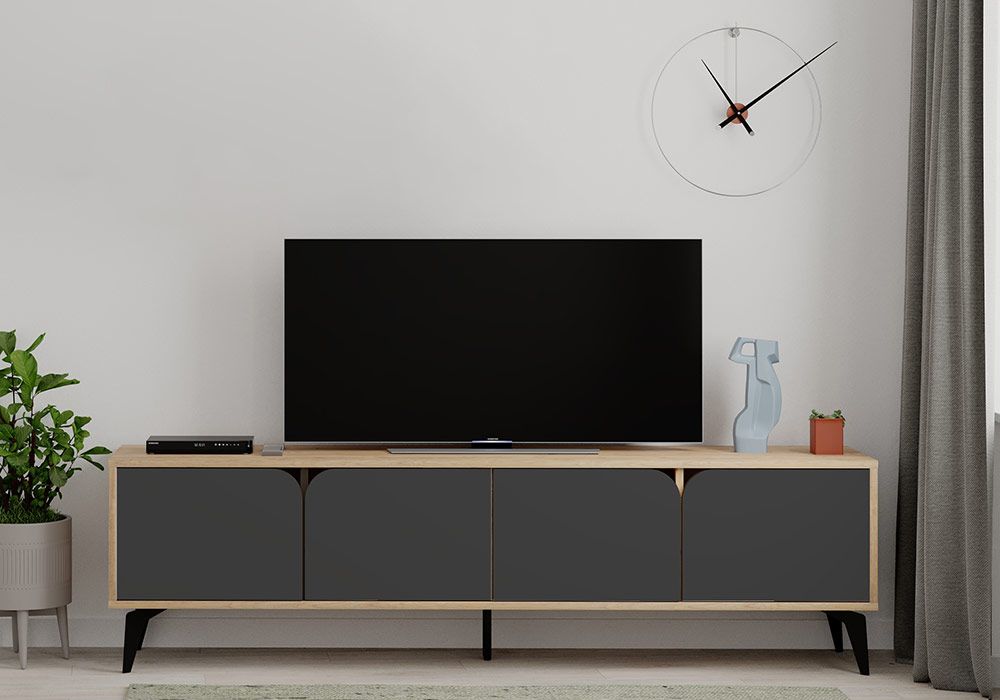Le meuble TV Nola avec son design industriel, ses couleurs intemporelles, apportera une touche chic à votre séjour ! Pratique, son long plateau recevra votre écran plat et vous pourrez ranger vos appareils multimédia et petits objets derrière les 4 portes spacieuses.