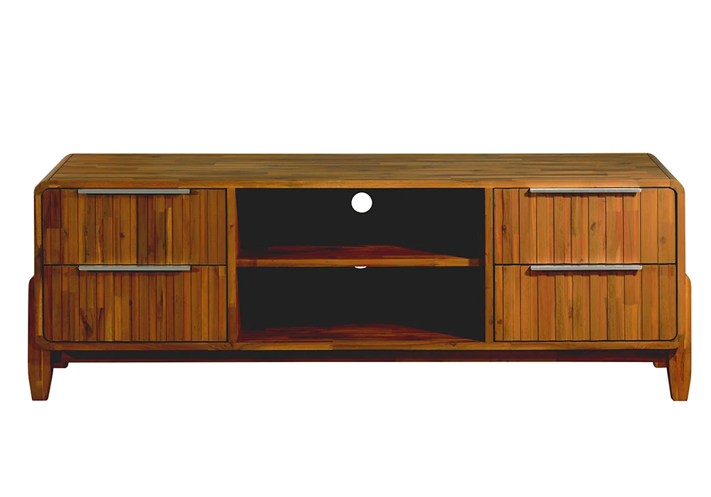 Doté de 4 tiroirs intégrés, ce meuble TV en acacia massif offre une grande capacité de rangement pour vos accessoires multimédias, télécommandes, câbles et objets du quotidien, tout en conservant un salon ordonné et épuré.