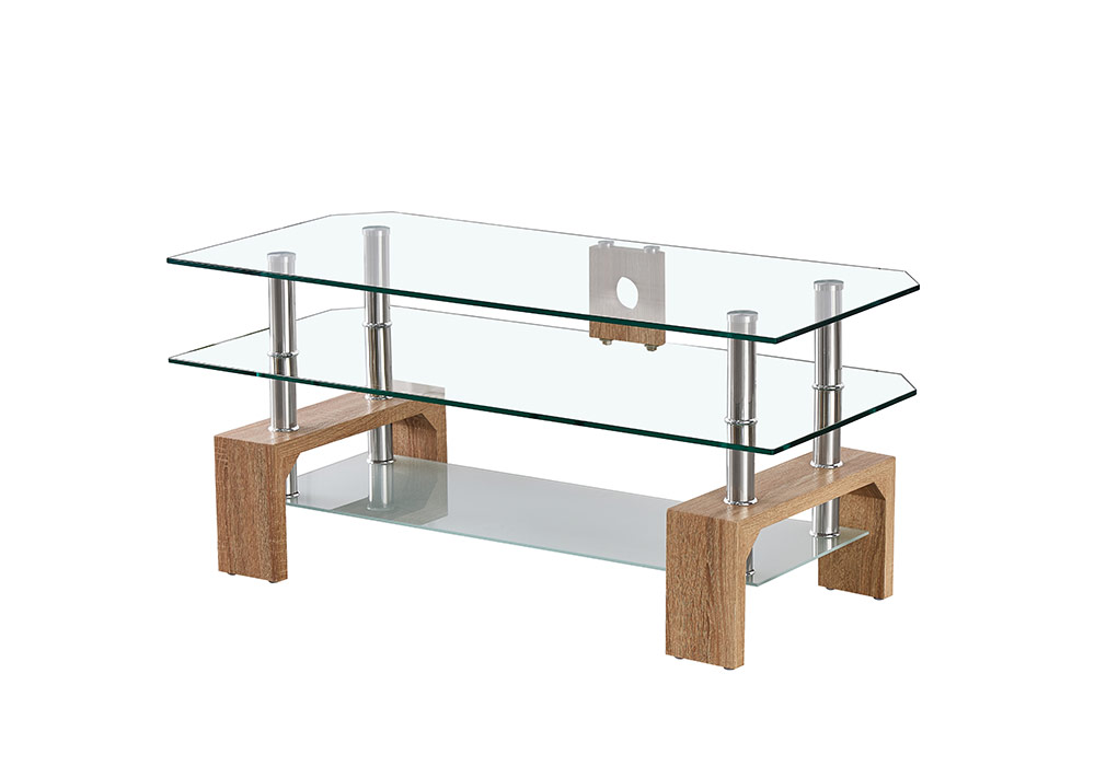 Le meuble TV Podium trouvera facilement sa place dans votre salle de séjour.  Les pieds élégant en mdf couleur bois se complètent à la perfection avec le dessus de table en verre transparent