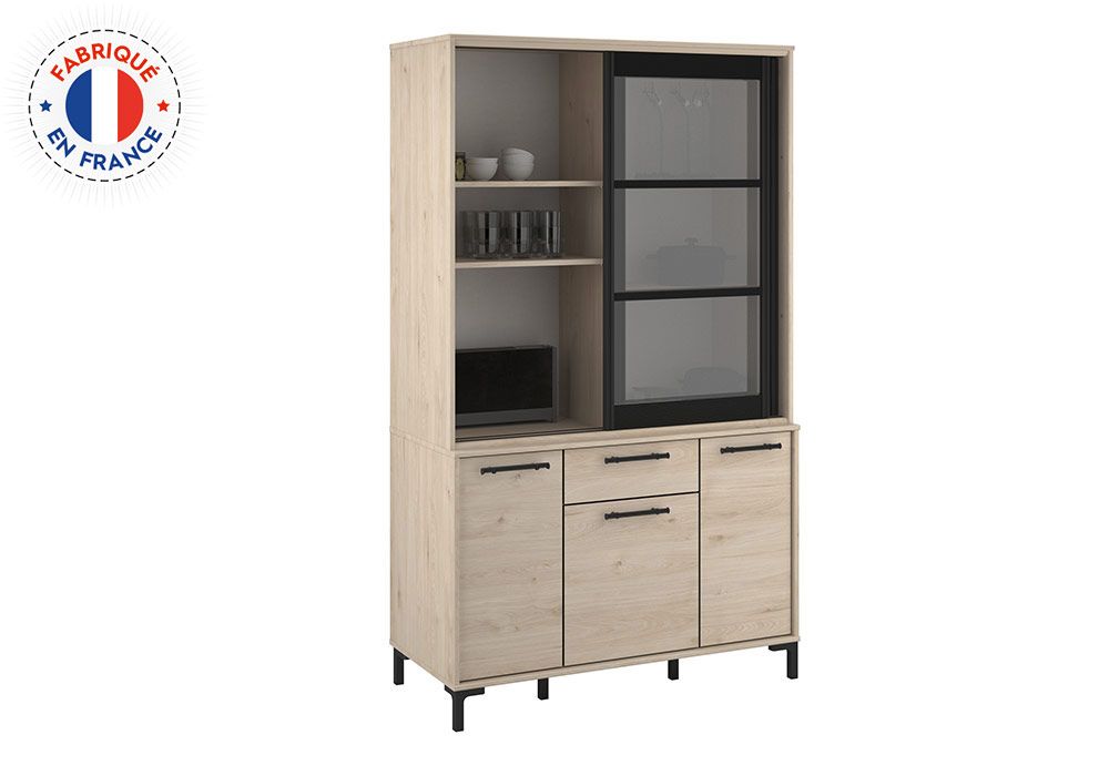 Derrière ses portes de grandes étagères idéales pour la vaisselle et les objets décoratifs. Réalisée en panneaux de particules, cette vitrine restera bien stable année après année.