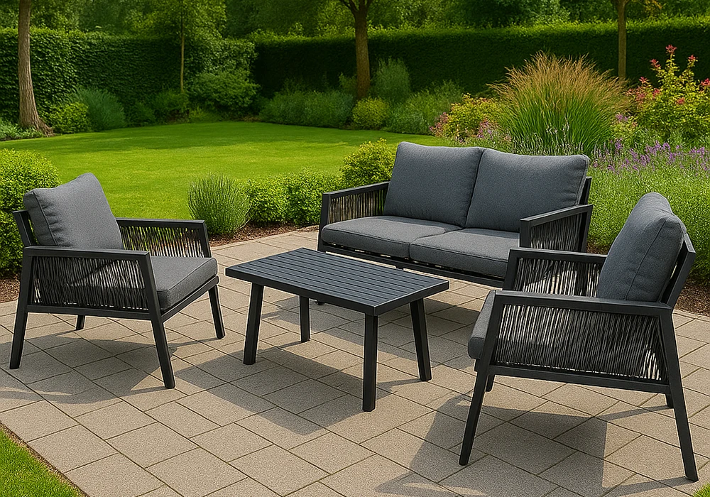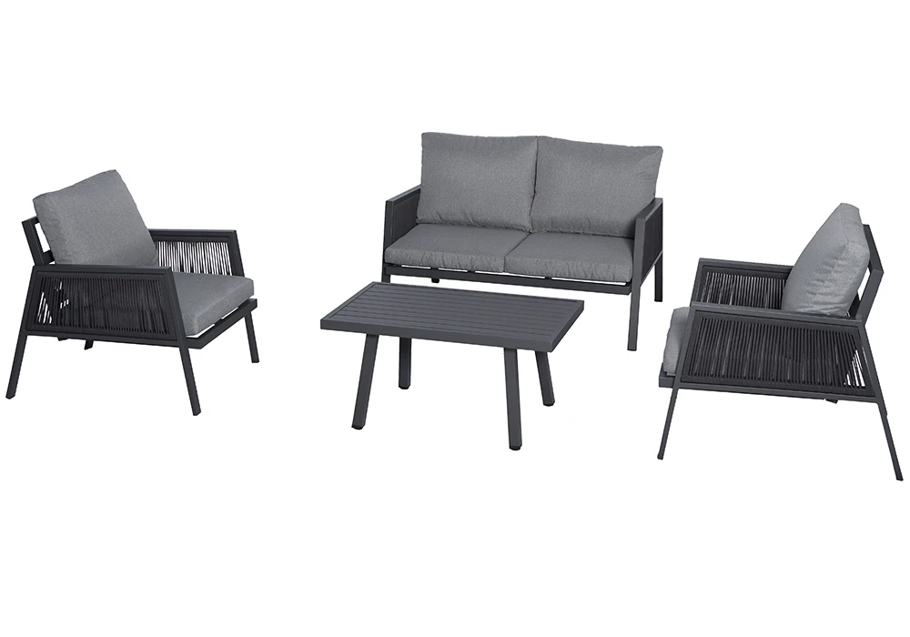 Salon de jardin en aluminium et corde textilène coloris gris, assises et dossiers en tissus d’extérieur imperméable et résistant coloris gris.