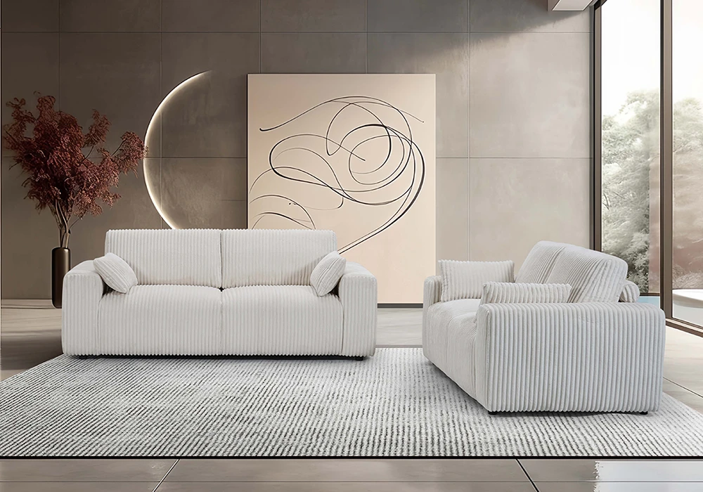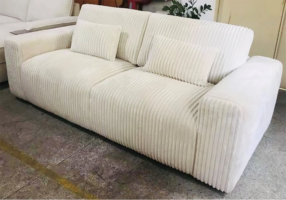 Structure en panneau de particules, assise mousse en polyuréthane recouverte de tissus microfibre côtelé épais coloris gris ou blanc.