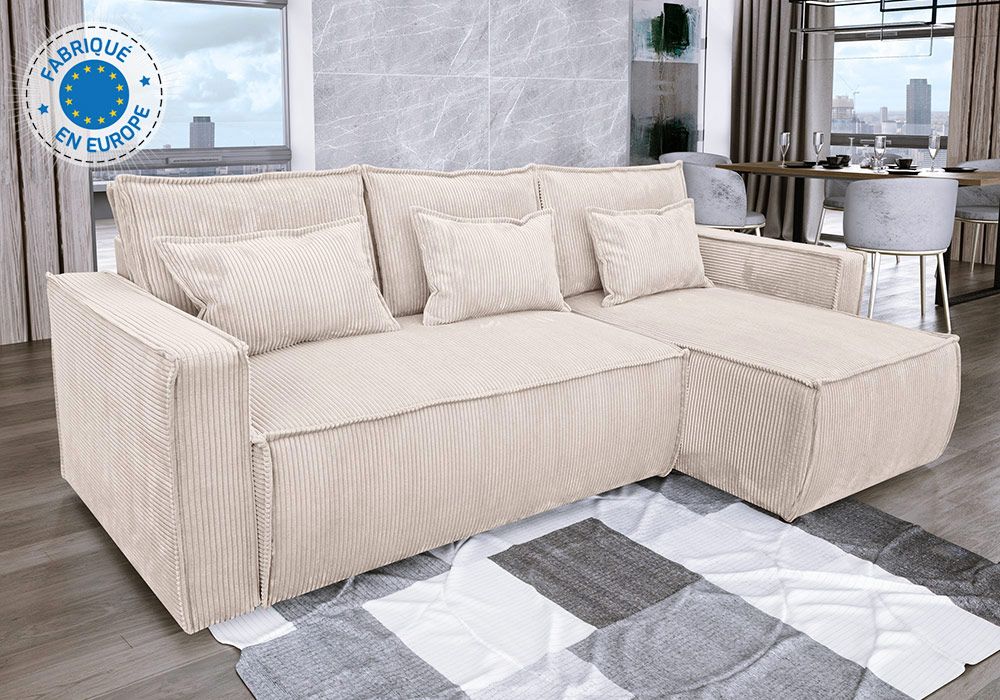 Installé au centre de votre salon, le canapé d’angle Melania sera la pièce la plus attractive de votre décoration intérieur. Véritable source de relaxation et de confort, ce canapé d’angle vous permet de profiter d’un moment de détente en famille tout en regardant un bon film.