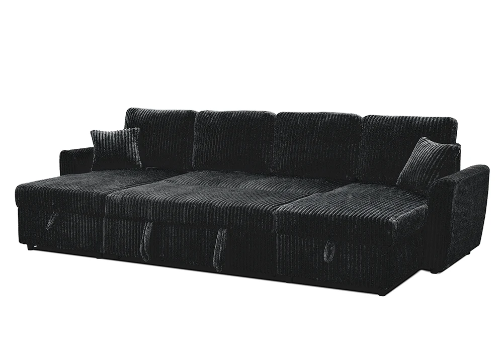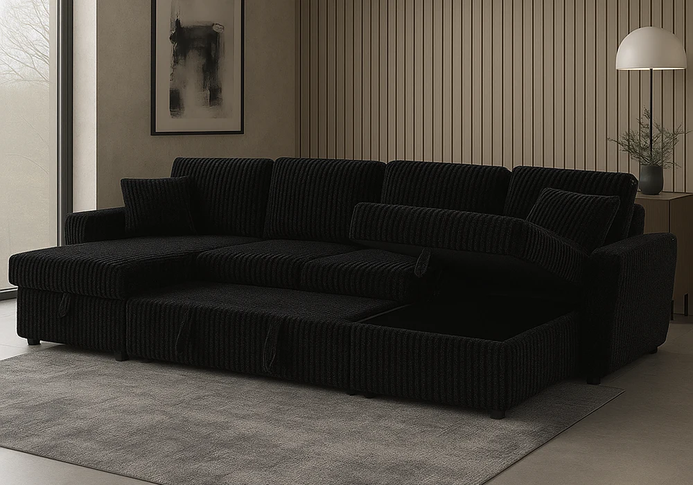 Pensé pour sublimer les grands espaces avec élégance, le Salon d’Angle Convertible Majestic Panoramique incarne le confort XXL, la modularité intelligente et le design contemporain dans sa plus belle expression. Sa structure en panneau de particules garantit une robustesse durable, tandis que l’assise en mousse polyuréthane assure un soutien optimal et un accueil moelleux. Le tout est habillé d’un tissu microfibre côtelé épais, au toucher velouté et à l’esthétique raffinée, disponible en coloris noir ou gris, pour s’adapter à tous les styles d’intérieur.