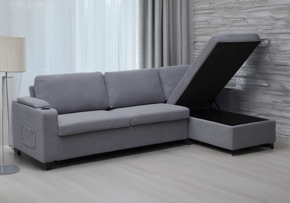Doté d’un mécanisme métallique fiable, ce canapé d’angle se transforme aisément en lit, vous offrant un couchage confortable avec matelas à mémoire de forme. Sa méridienne astucieuse cache un coffre de rangement idéal pour vos plaids et coussins. Et pour un confort optimal, profitez du porte-gobelet intégré sur l’accoudoir, parfait pour vos moments de détente.