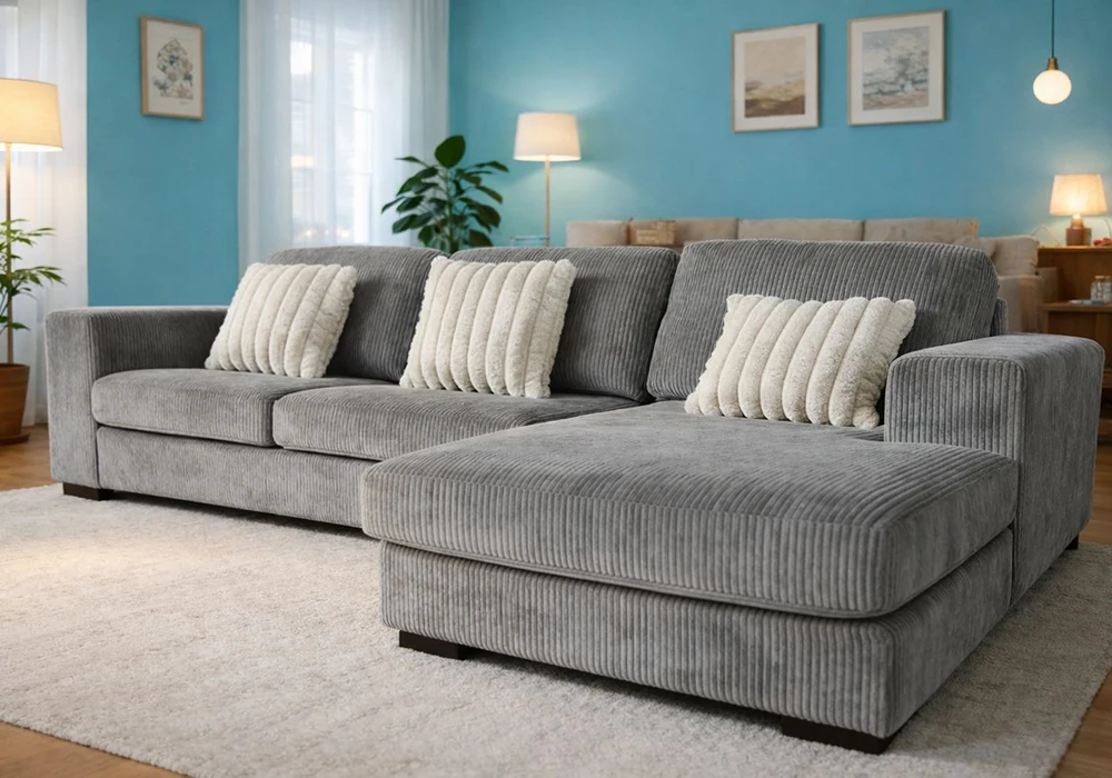 Le salon d’angle JONIA gris est pensé pour offrir un confort exceptionnel tout en apportant une touche moderne et élégante à votre intérieur. Son revêtement en tissu microfibre épais côtelé confère une sensation douce et chaleureuse, idéale pour les moments de détente en famille ou entre amis.