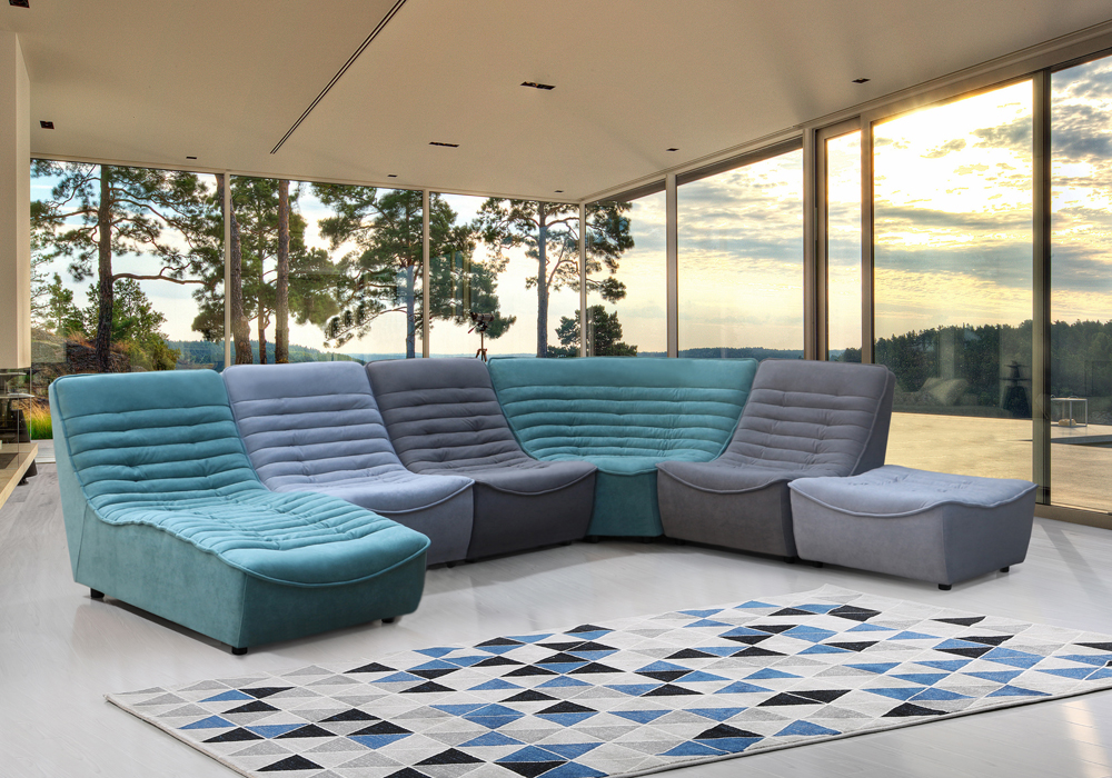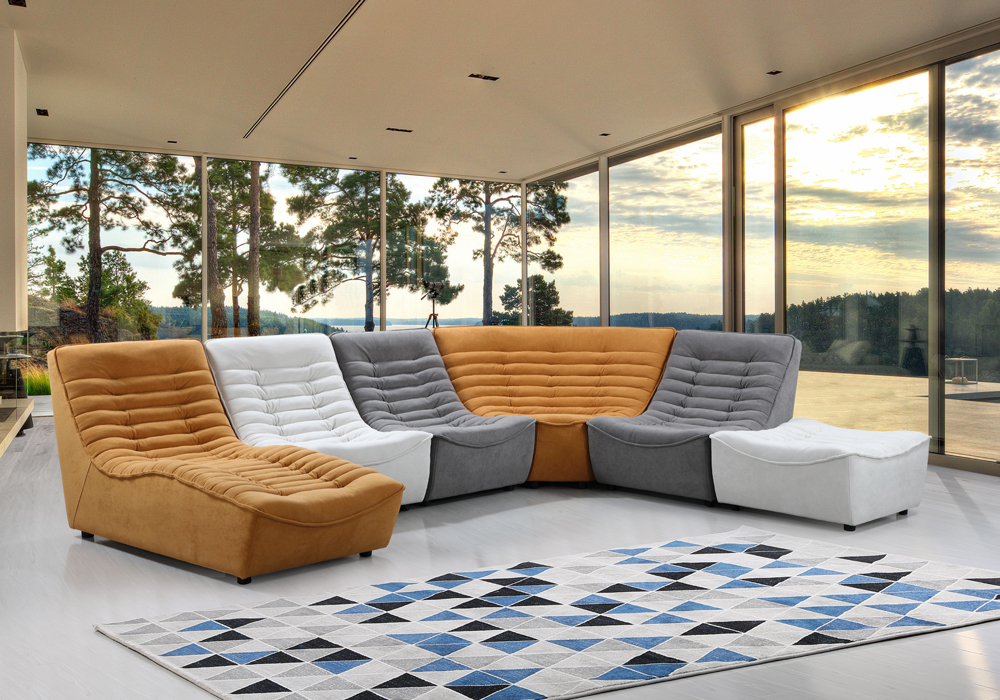 Ce salon moderne et design est un canapé d’angle panoramique modulable , revêtu d’un tissu coloré. Une association de couleurs qui sera en parfaite harmonie avec votre intérieur. Particularité de ce canapé d’angle il est très confortable et reposant. Composez votre canapé selon vos envies , home sweet home !