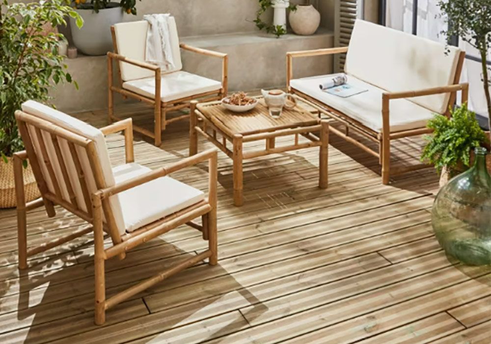 Le salon Hanna en bambou solide et résistant est le parfait allié du jardin. Son aspect artisanal fait l’unanimité auprès des adeptes de la décoration bohème chic.