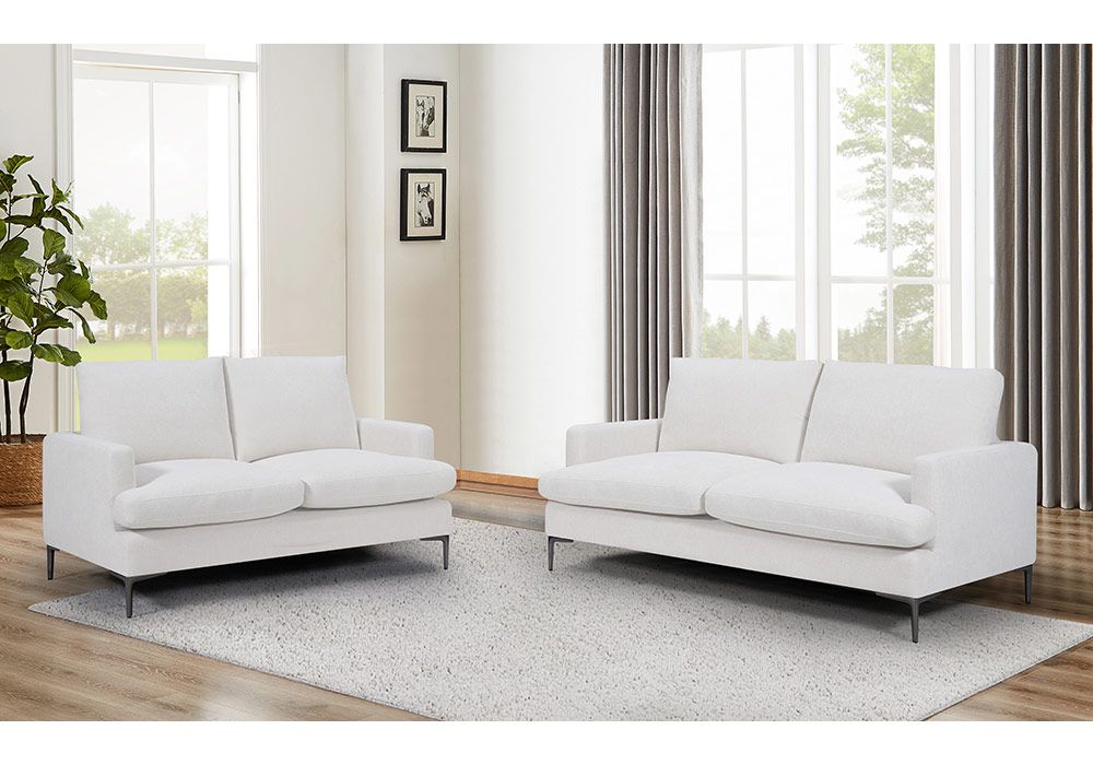 Structure en panneau de particules, piétement en métal, assise mousse en polyuréthane recouverte de tissus coloris gris ou blanc.