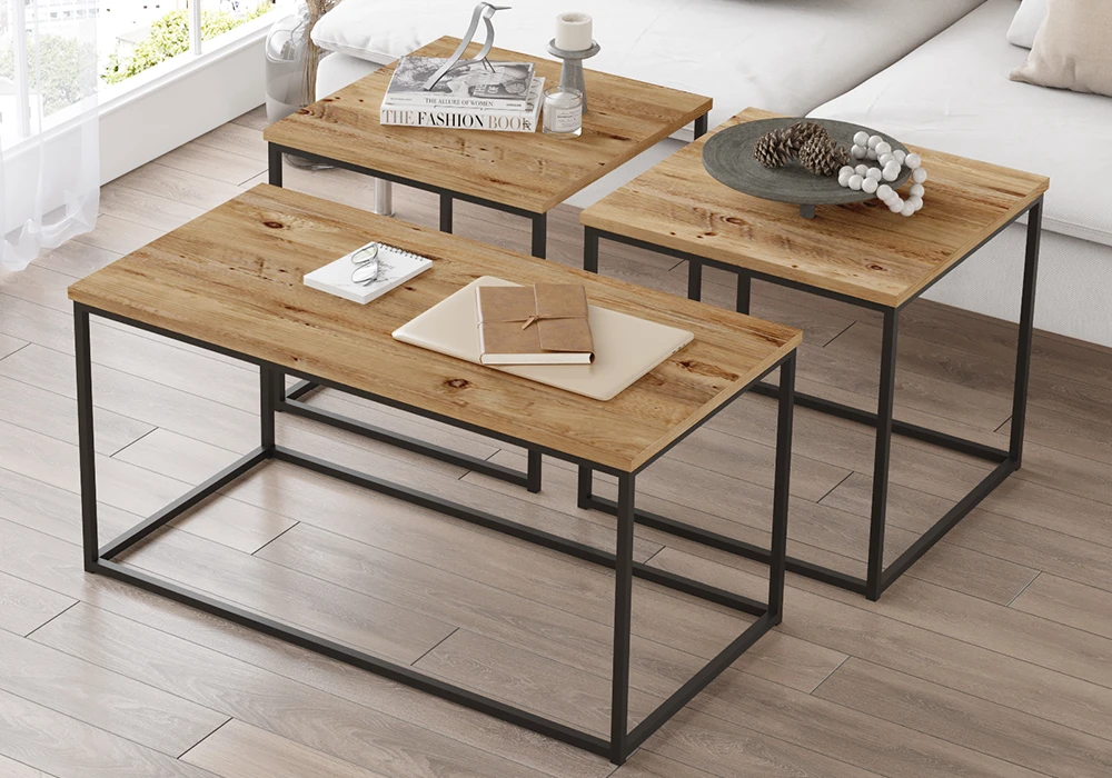 Les tables sont fabriquées avec une structure en métal robuste, finition noire, qui apporte une touche industrielle. Les plateaux sont en MDF avec un revêtement couleur chêne clair, offrant un contraste élégant. Le style industriel se caractérise par des lignes épurées, des matériaux bruts et des détails fonctionnels.