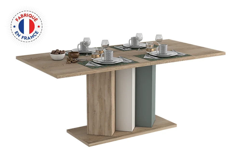 Structure en panneau de particules recouvert de papier coloris hêtre / vert. Plateau extensible de 180cm de longueur allant jusqu’à 225cm grâce à une allonge de 45cm