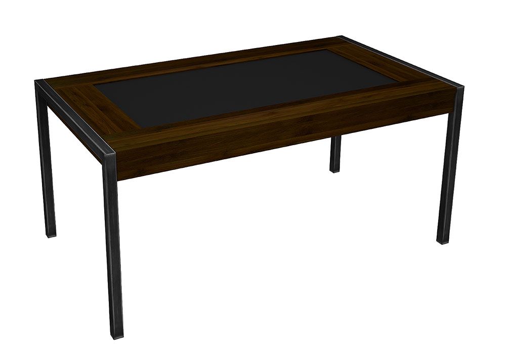 Structure en panneau de particules recouvert de papier coloris noyer / noir, piétement et poignées en métal noir, 180x90xH75cm.
