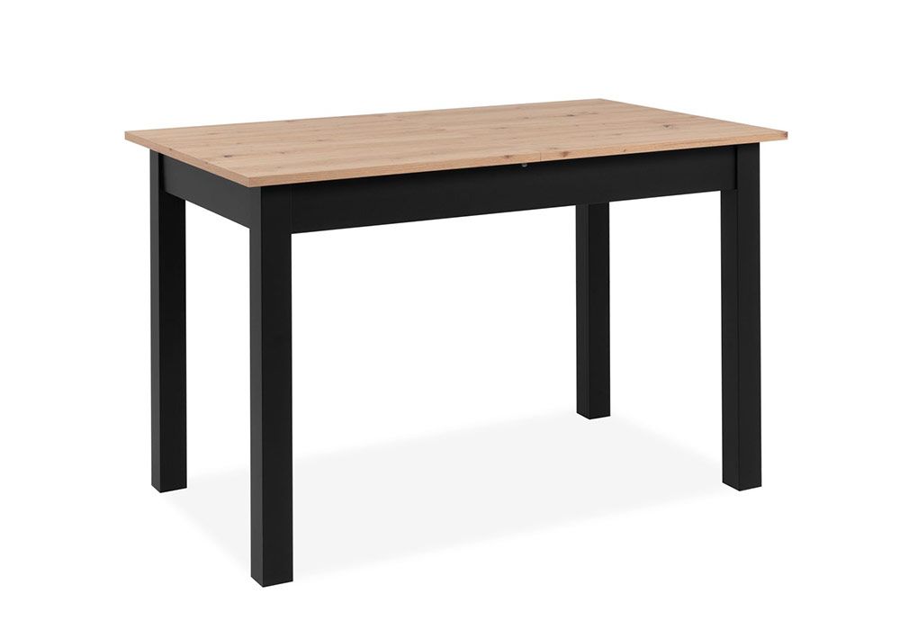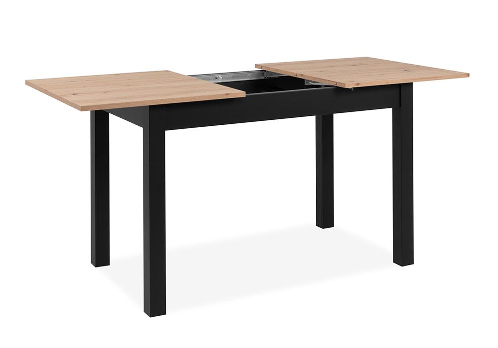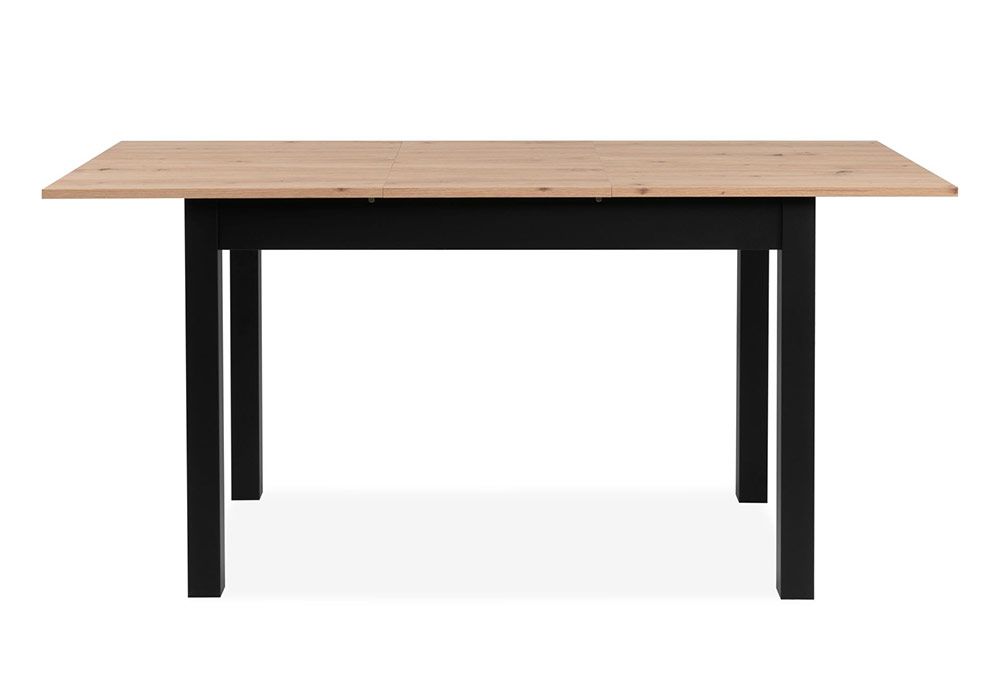 Structure en panneau de particules mélaminé, plateau chêne, piétement coloris noir, 131/177x80xH76cm.