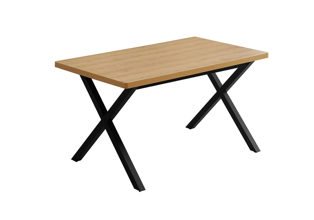 La structure de la table est réalisée en MDF recouvert de papier coloris chêne clair, offrant un rendu chaleureux et lumineux. Son plateau à chants naturels apporte une touche authentique et tendance, rappelant l’aspect du bois massif. Le piètement en métal noir assure une excellente stabilité tout en renforçant le caractère contemporain de la table.