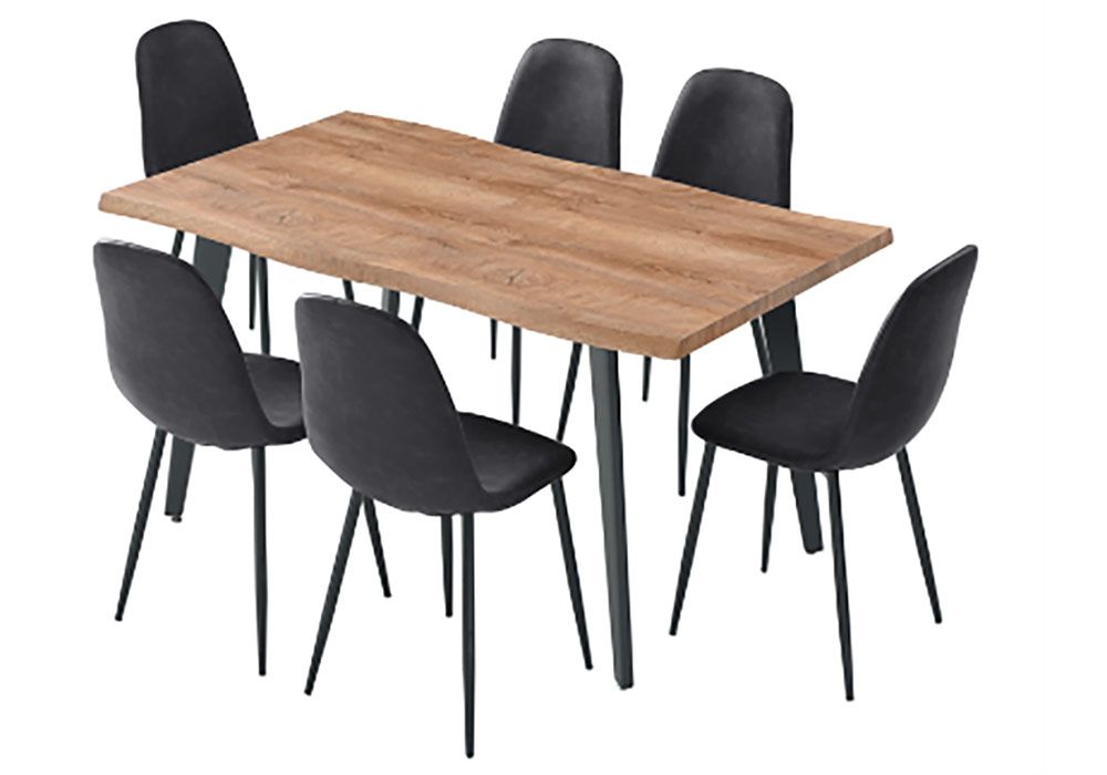 Table en structure en panneaux de particules recouvert de papiers coloris noyer, piètement en métal noir.