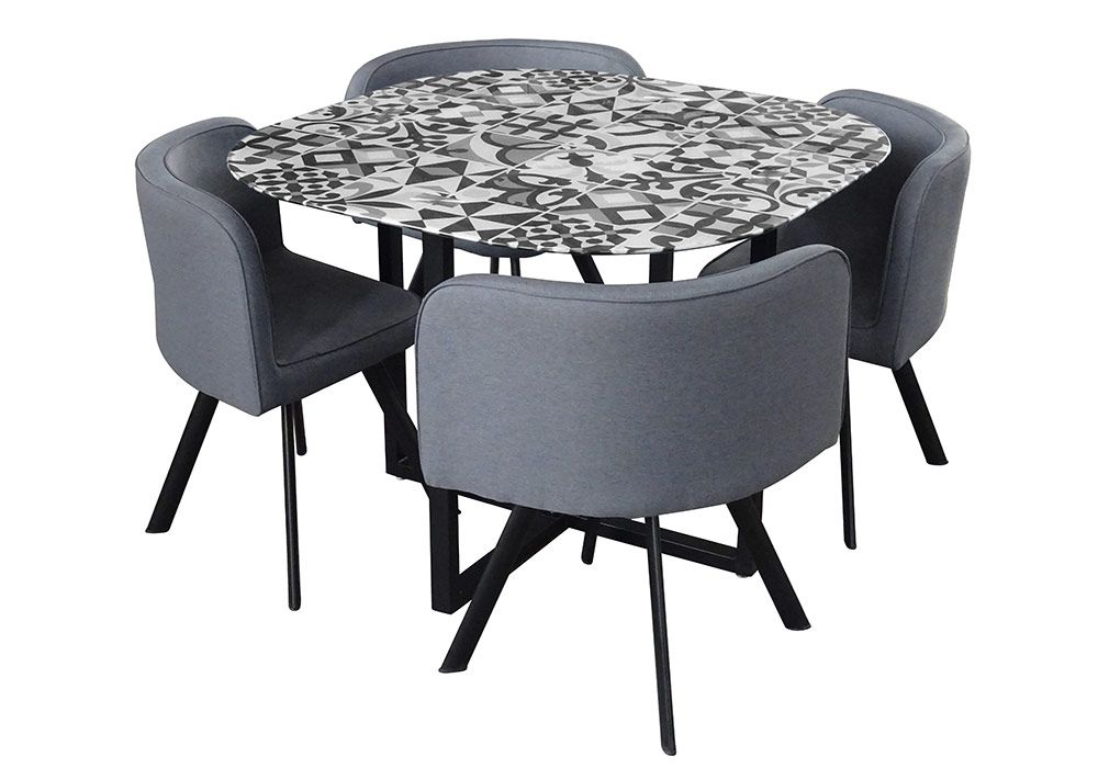 Structure de la table en métal coloris noir, plateau en verre trempé 8mm avec décor mosaïque gris, chaises en tissus gris.
