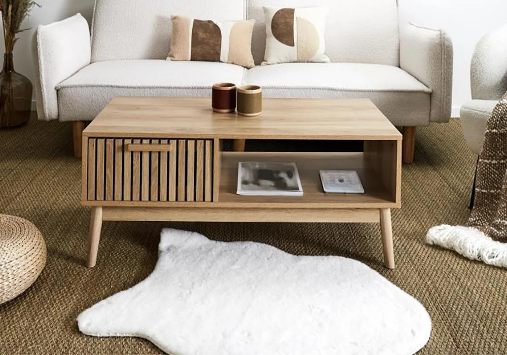 Transformez votre salon avec notre élégante table basse à 1 tiroir de la collection Klaus, conçue dans le style Japandi. Ce meuble incarne la simplicité zen japonaise combinée à la chaleur scandinave. Fabriquée à partir de panneau de particules et de MDF, sa structure offre robustesse et durabilité, tandis que le revêtement en papier décor ajoute une touche naturelle et raffinée. Le piétement en pin massif assure une stabilité accrue, tout en apportant une note chaleureuse à l’ensemble.