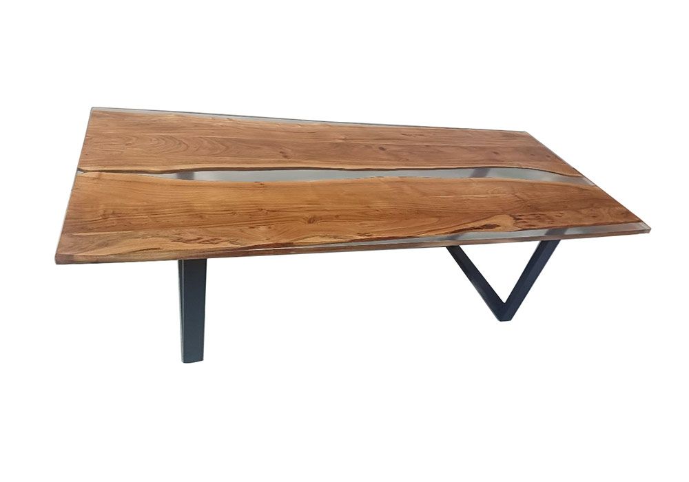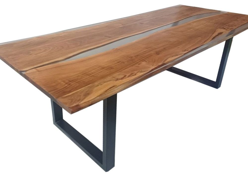 Plateau en BOIS D’ACACIA MASSIF, design avec rivière en résine d’époxy coloris clair, piètement en métal.