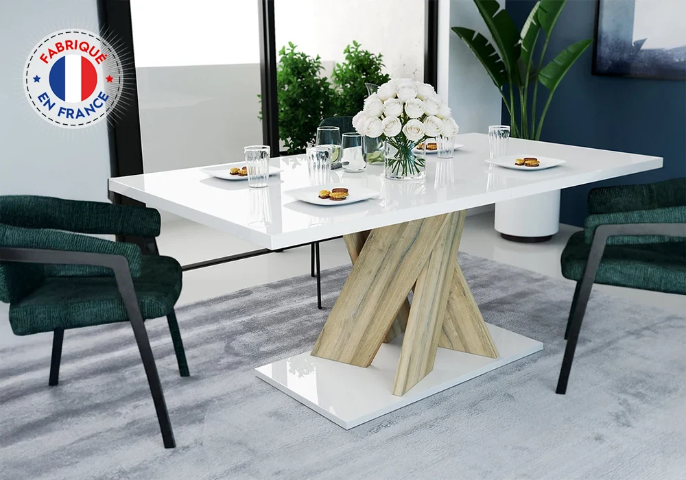 Prévue pour 6 à 8 personnes, cette table extensible peut accueillir jusqu’à 10 convives grâce à son allonge centrale de 45 cm, qui permet de passer de 180 cm à 225 cm en toute simplicité. Son plateau de 100 cm de large repose sur un piétement central sculptural, composé de panneaux croisés finition bois clair, pour un rendu graphique et moderne.