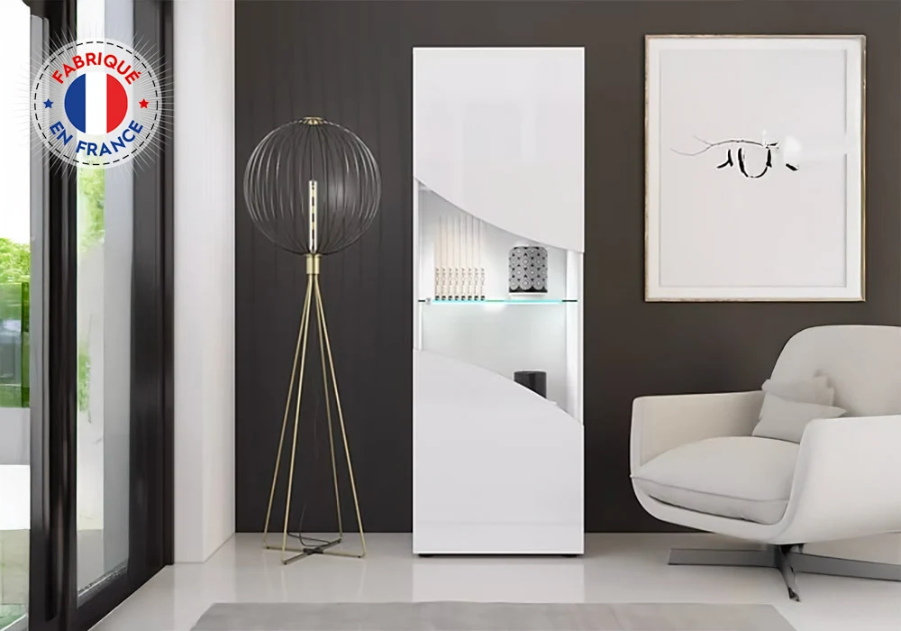 Pensée pour les séjours contemporains, cette vitrine repose sur une structure en panneau de particules épais, revêtue de papier blanc brillant, avec des bandeaux arrondis en PVC laqué qui soulignent son allure graphique. Les portes à charnières métalliques avec frein et les coulisses invisibles à fermeture douce garantissent une expérience d’usage haut de gamme.