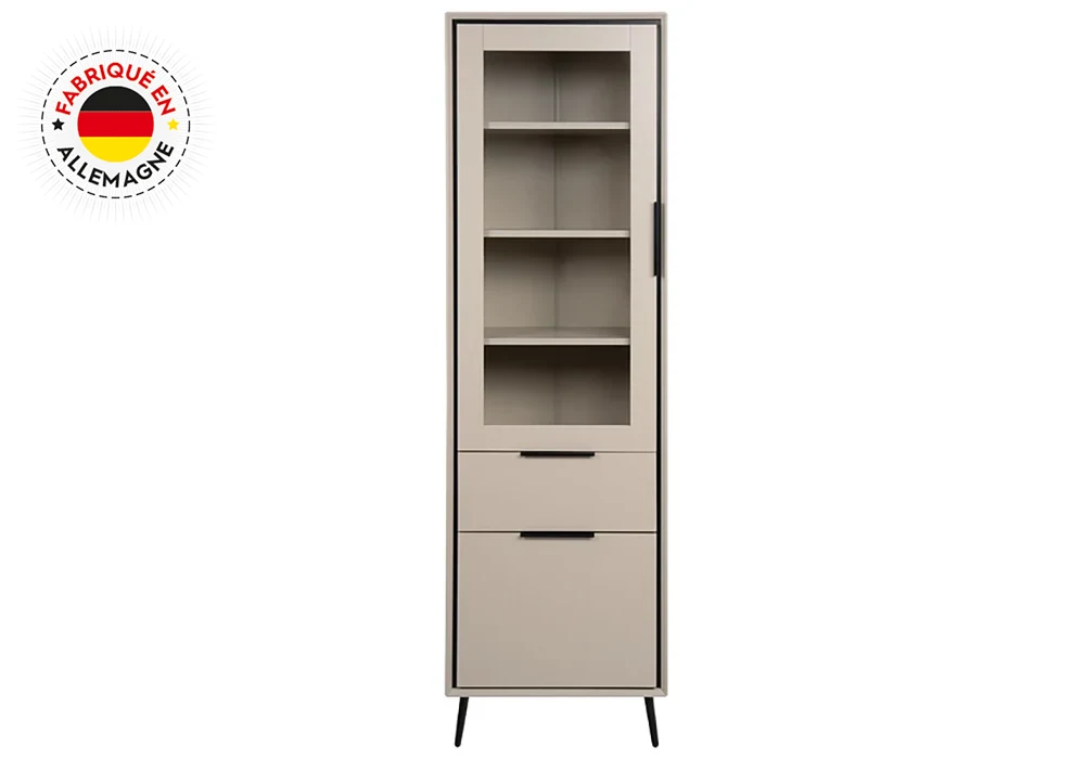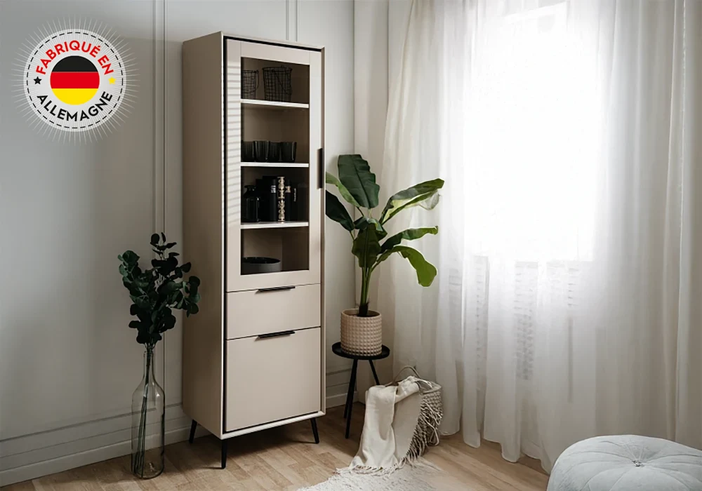 La vitrine Arona joue avec les contrastes pour sublimer votre intérieur. Sa porte vitrée dévoile vos plus beaux objets déco ou vaisselle, tandis que sa porte pleine et son tiroir dissimulent avec élégance ce que vous préférez garder à l’abri des regards. Le décor taupe apporte une touche chaleureuse, rehaussée par les poignées et le piètement noirs au style contemporain affirmé.