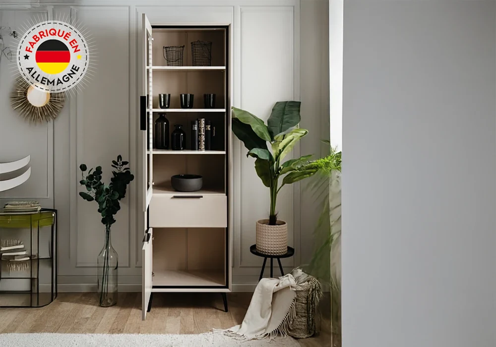 Pensée pour les amateurs de design fonctionnel, cette vitrine allie esthétisme et qualité grâce à une fabrication allemande soignée. Elle s’intègre parfaitement dans un salon, une salle à manger ou un bureau moderne.